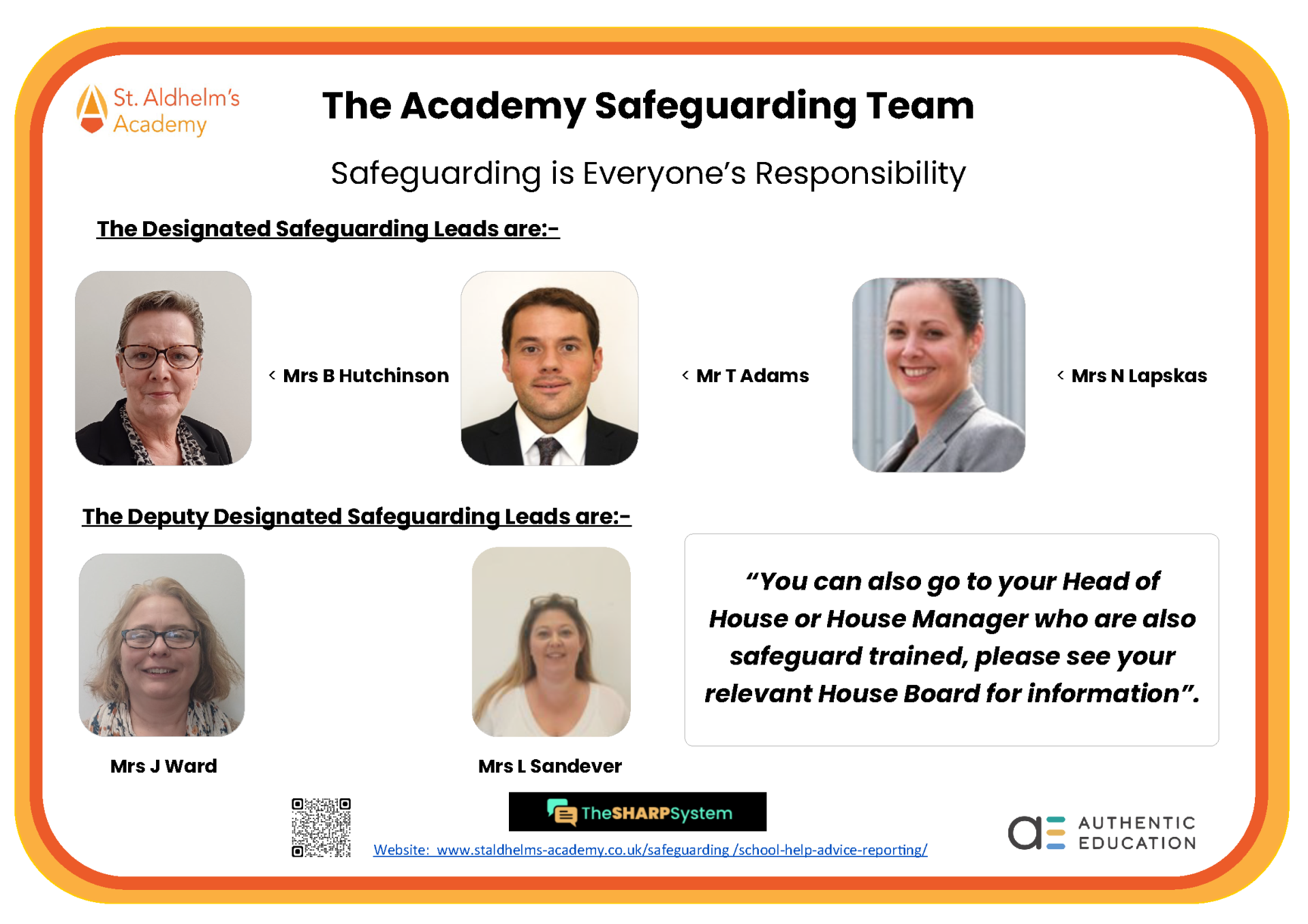 If you are worried about something or have concerns about someone else then please speak to a member of the Safeguarding Team. The Designated Safeguarding Team at St Aldhelm's are: